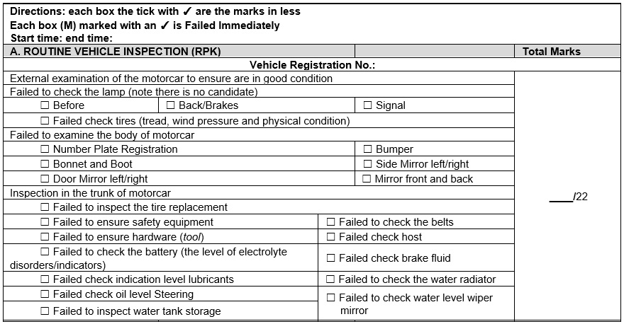 Aforementioned process to affirm the satisfactory condition of car is called Routine Vehicle Inspection [Rutin Pemeriksaan Kenderaan (RPK)] in Malaysia. RPK test is an essential component of JPJ driving licence test. All candidates need to conduct RPK in front of JPJ examination officer before starting driving test in driving school’s circuit area. RPK test carries 22 marks, to pass the test, candidate must obtain 18.7 marks. The picture below shows the details of marks structure: