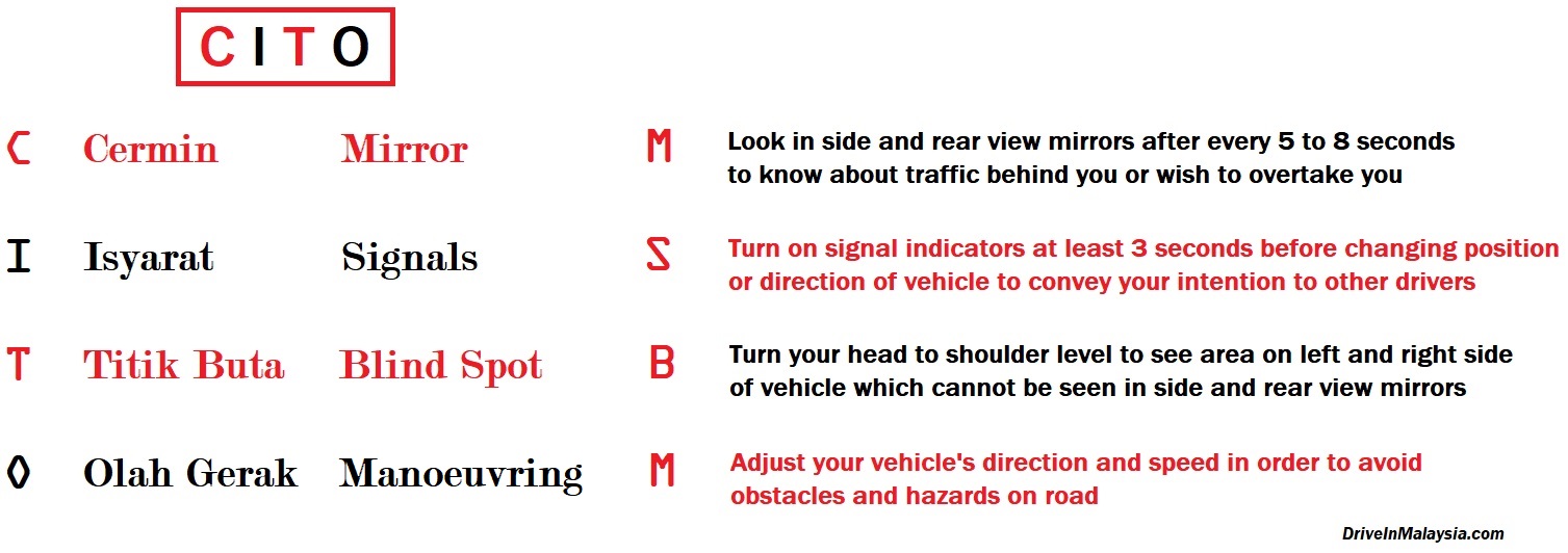 When you are driving, you must keep yourself in attentive state and consistently collect information about current on road traffic in front, behind or in the sides of your vehicle. In addition, you must appositely transmit signals to other road users in order to convey your driving-specific intentions to let them know or anticipate your road movements. CITO is an acronym for “Cermin, Isyarat, Titik Buta, Olah Gerak”. In English the acronym becomes MSBM i.e., “Mirror, Signals, Blind Spots, Manoeuvring”. CITO principle exposits that drivers should consistently use side and rear view mirrors to become aware of the road users around them and their intentions; drivers must convey their own driving-specific intentions to other road users by using signal indicators; drivers should not ignore left and right blind spots; and finally, drivers should move on road skilfully and carefully.
